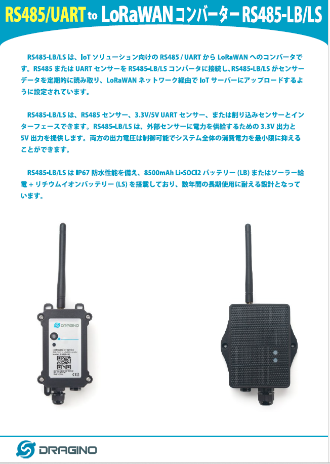 Dragino RS485-LB/LSは、IoTソリューション向けのRS485 / UARTからLoRaWANへのコンバータです。 RS485またはUARTセンサーをRS485-LB/LSコンバータに接続し、RS485-LB/LSがセンサーデータを定期的に読み取り、LoRaWANネットワーク経由でIoTサーバーにアップロードするように設定できます。